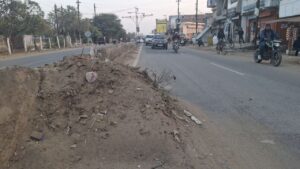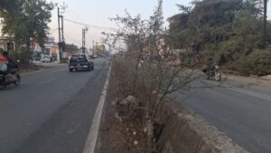 दमोह-जबलपुर राज्य मार्ग के डिवाईटरों पर कटीली झांडियां,धूल,कचडे का अंबार